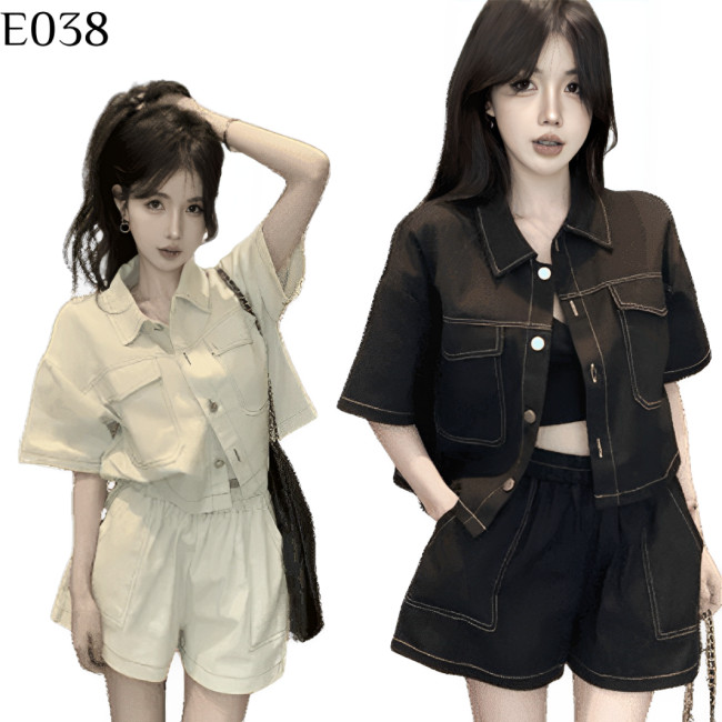 標籤: 韓版休閒翻領短袖套裝 女士寬鬆短款夾克+高腰短褲兩件套 春夏時尚顯瘦穿搭 編號:E038, E038, 休閒➠套裝➠春夏