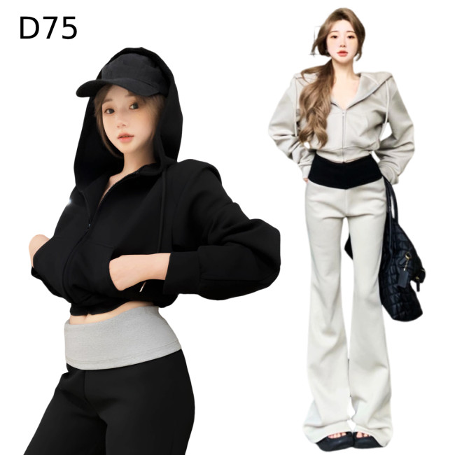 標籤: 長袖連帽短版上衣+撞色微喇叭長褲 套裝編號:D75, D75, 現貨商品(S)碼