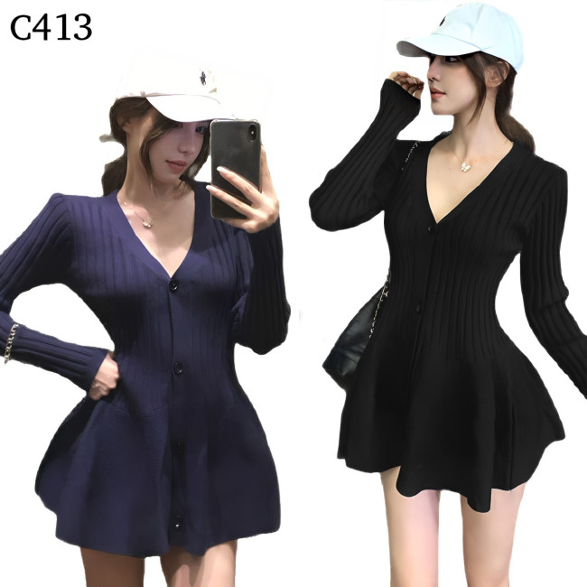 荷葉邊下擺V領針織修身開襟衫修身連身裙編號:C413