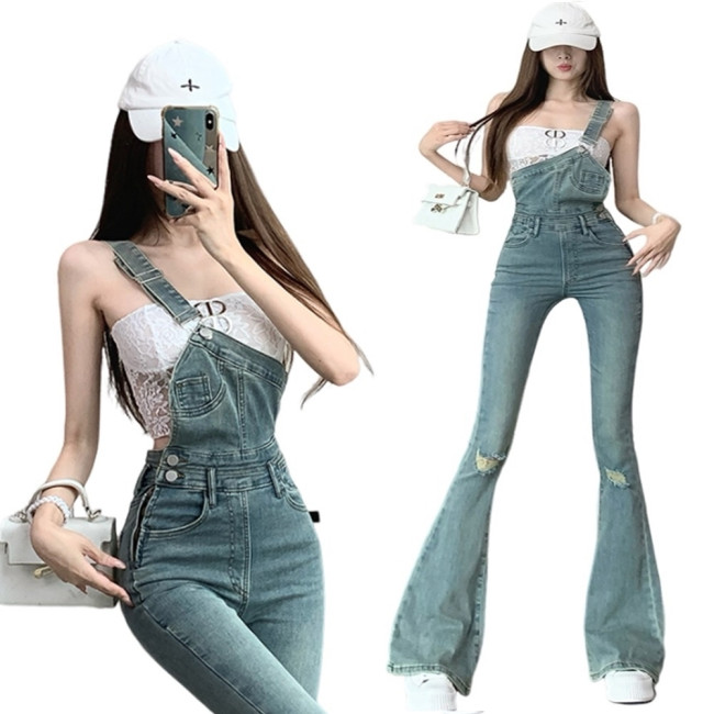 邊背帶牛仔褲毛邊破洞高腰顯瘦微喇拖地編號:C256