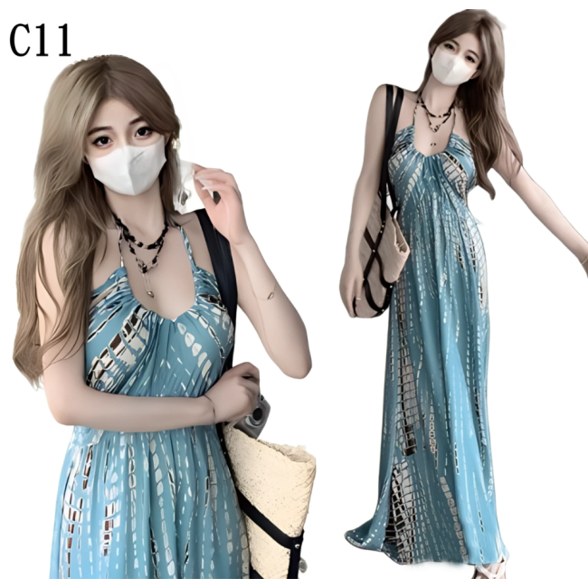 復古掛脖露背氣質大擺吊帶裙 編號:C11