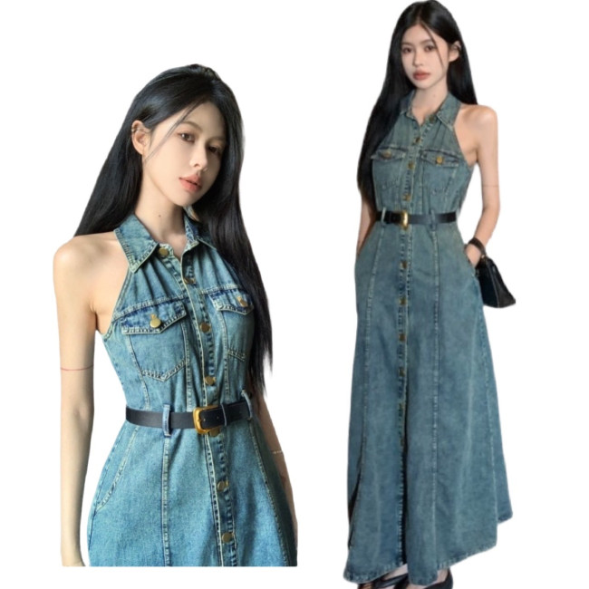 復古翻領無袖牛仔單排扣露肩連身長裙+腰帶 編號:C215