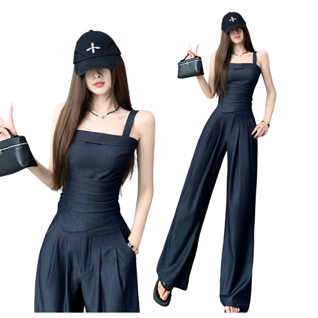 牛仔吊帶背心+高腰直筒闊腿褲兩件套 編號:C150