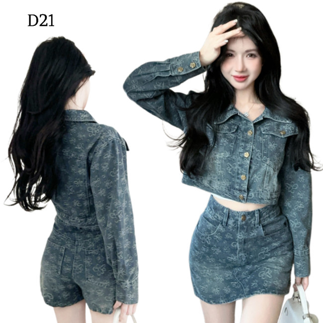 牛仔長袖外套+高腰短裙褲 套裝編號:D21