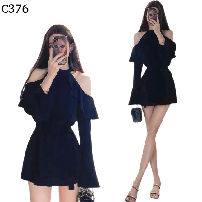 黑色露肩掛脖洋裝荷葉邊喇叭袖襯衫裙包臀短裙編號:C376
