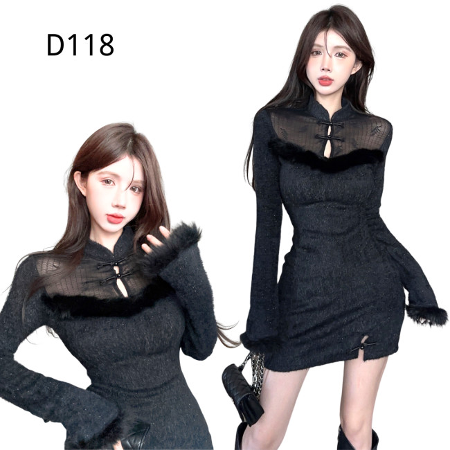 新中式辣妹黑色毛毛拼接旗袍收腰包臀裙 編號:D118