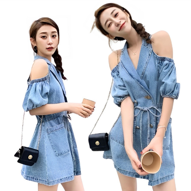 露肩掛脖泡泡袖牛仔連衣裙 編號:C165