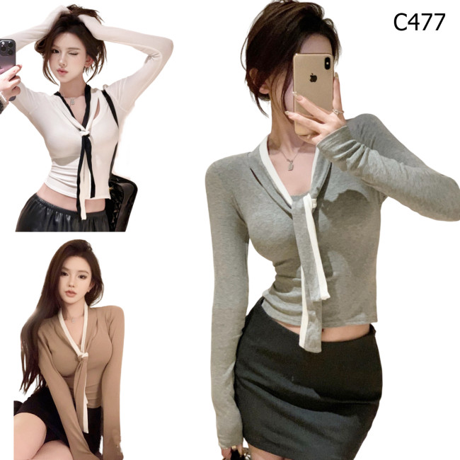 V領長袖拼接領帶針織衫毛衣設計感編號:C477