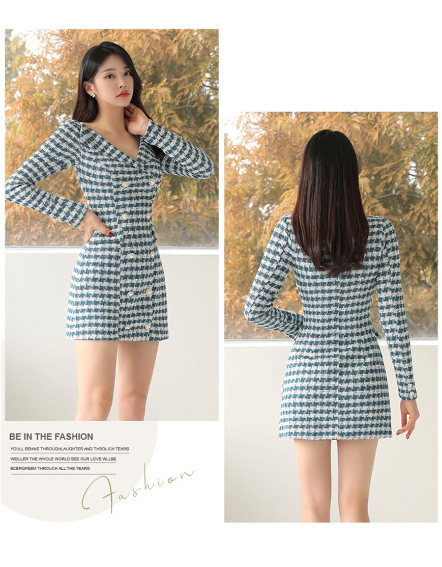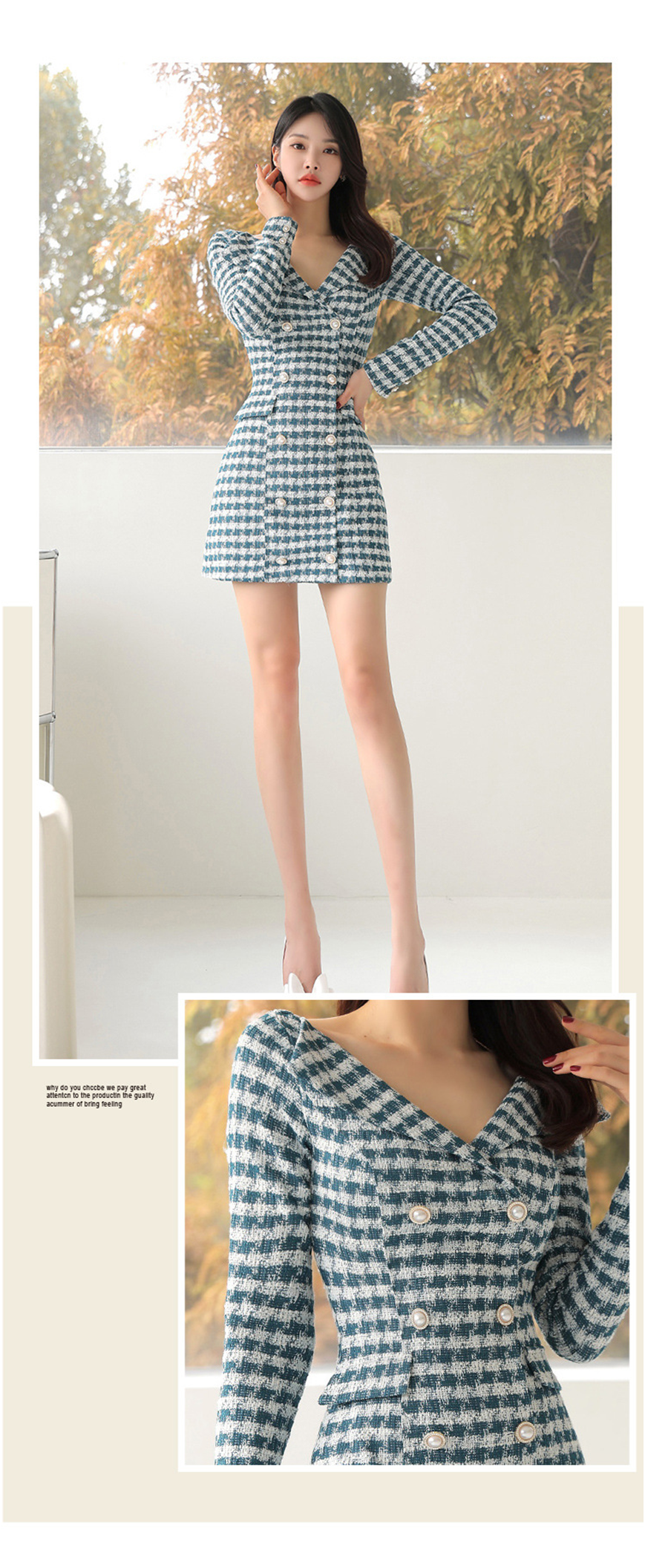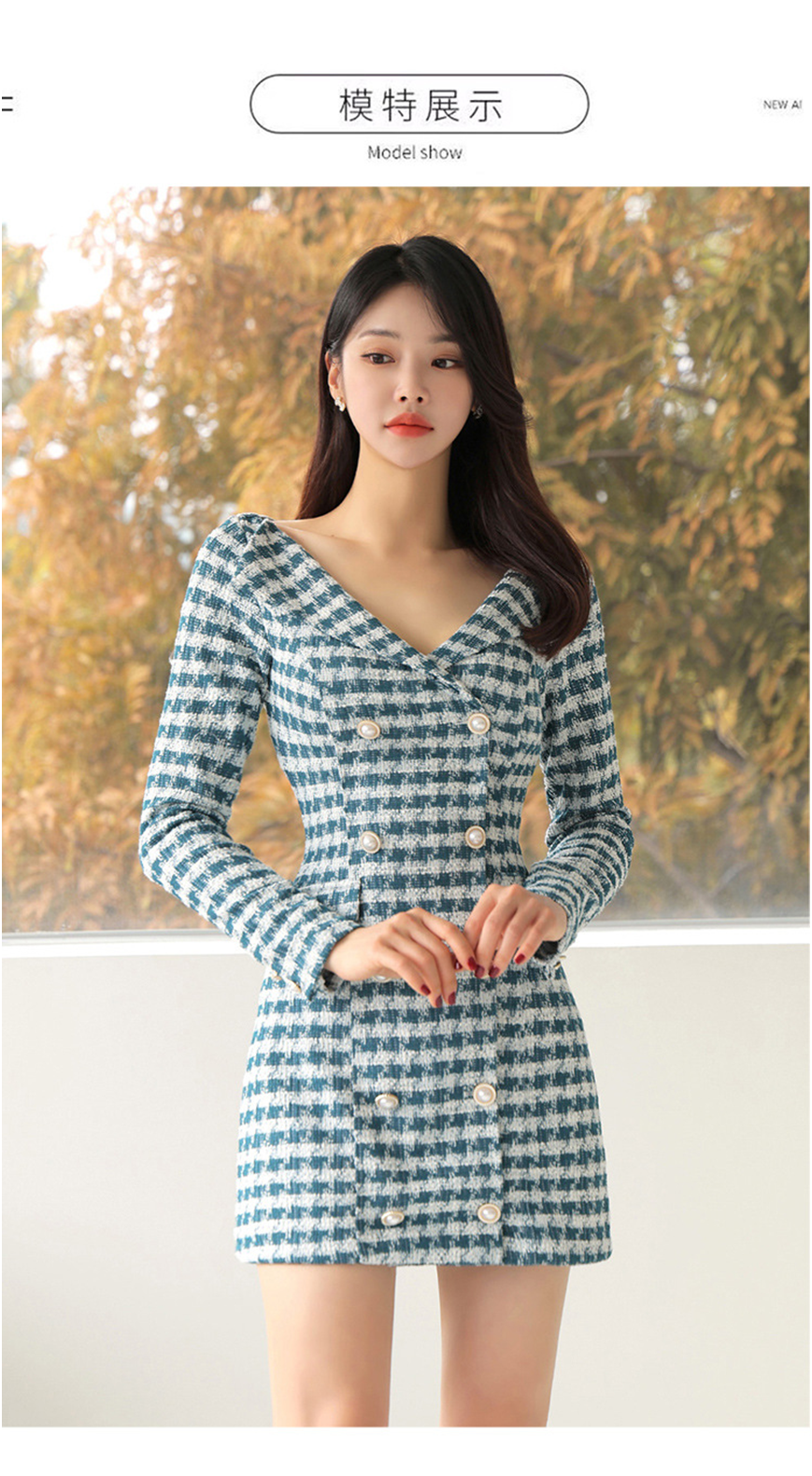小香風V領修身顯瘦千鳥格洋裝 編號:B413